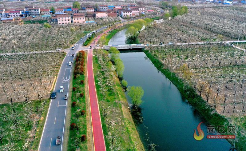 4月1日,航拍镜头下的宁陵县上清水河生态绿廊景观路线一角。