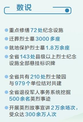 截至目前,全省共有210处烈士陵园与行政机关、企事业单位、学校等979个单位结对共建,定期开展与烈士认亲等红色传承活动。全省退役军人事务系统挖掘500余名英烈的事迹,开展英烈故事宣讲2万余场次,受众达300余万人次;组成60支英烈精神宣讲队开展红色宣讲,英烈事迹不断深入人心。