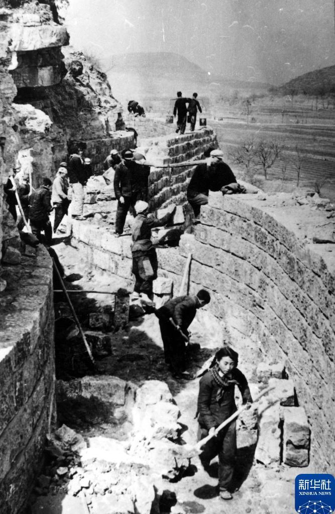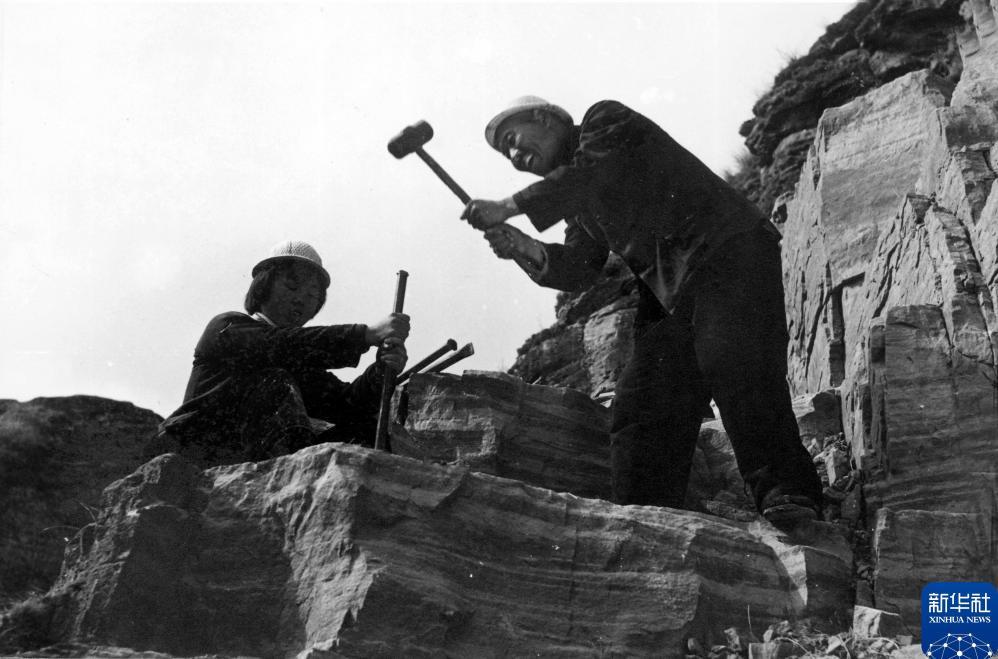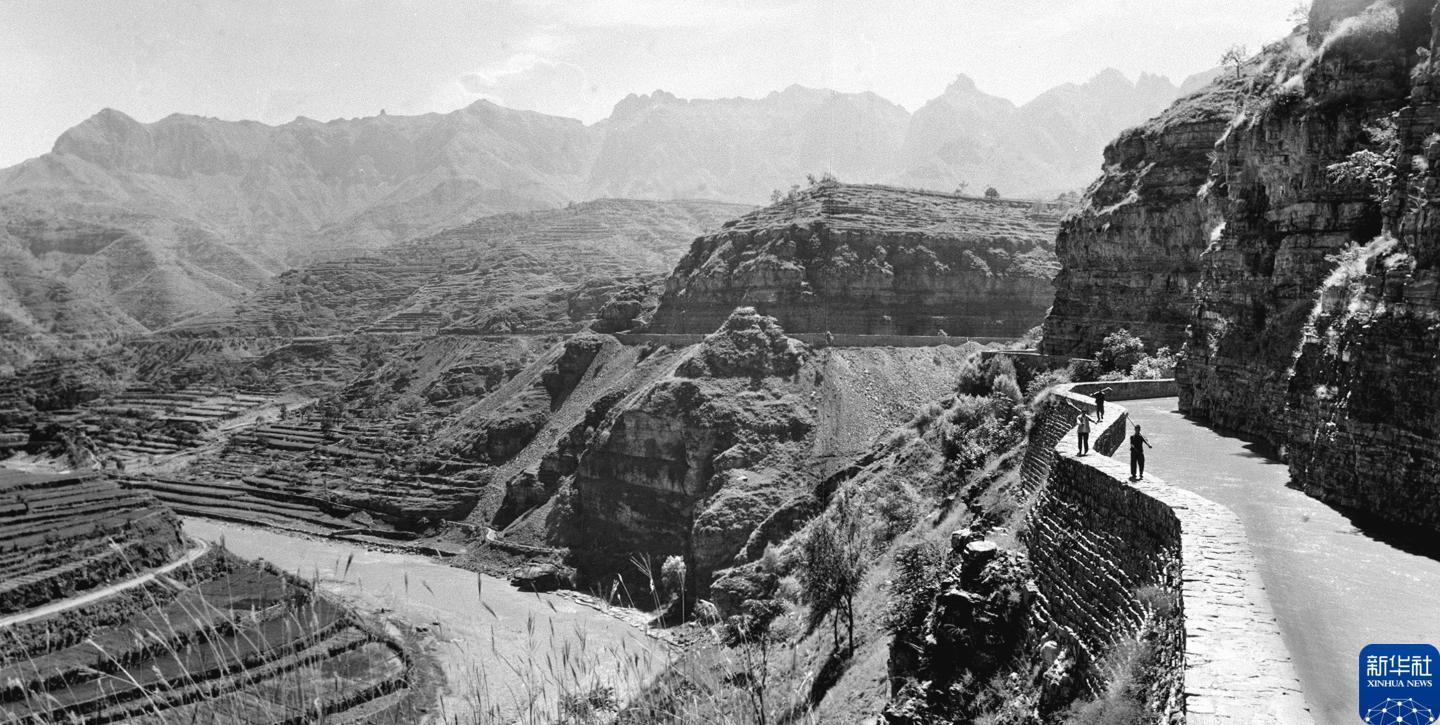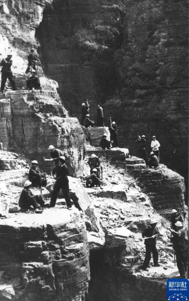 红旗渠施工时,人们在渠上作业(资料照片)。新华社发