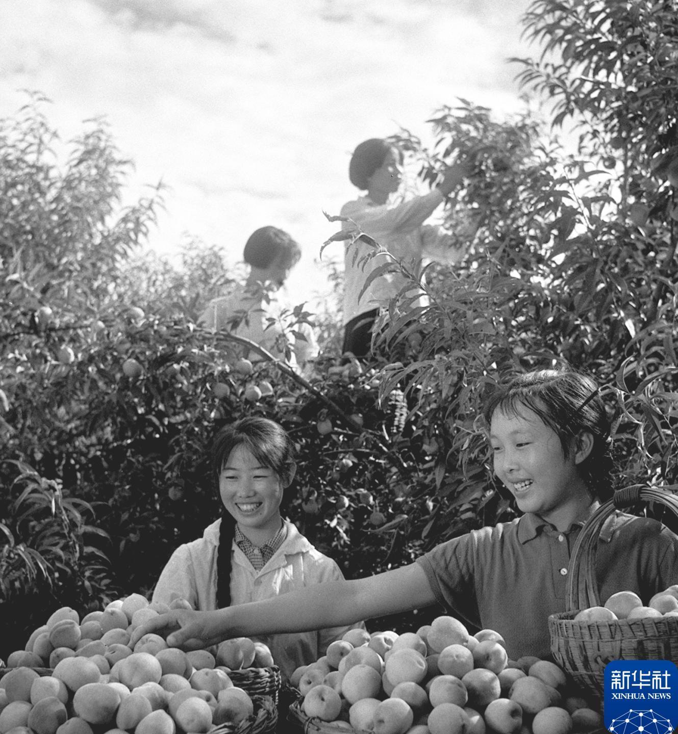 过去土薄石厚的山头,由于有了红旗渠水的浇灌,建起了一座座果园。这是人们在收摘蜜桃(资料照片)。新华社发