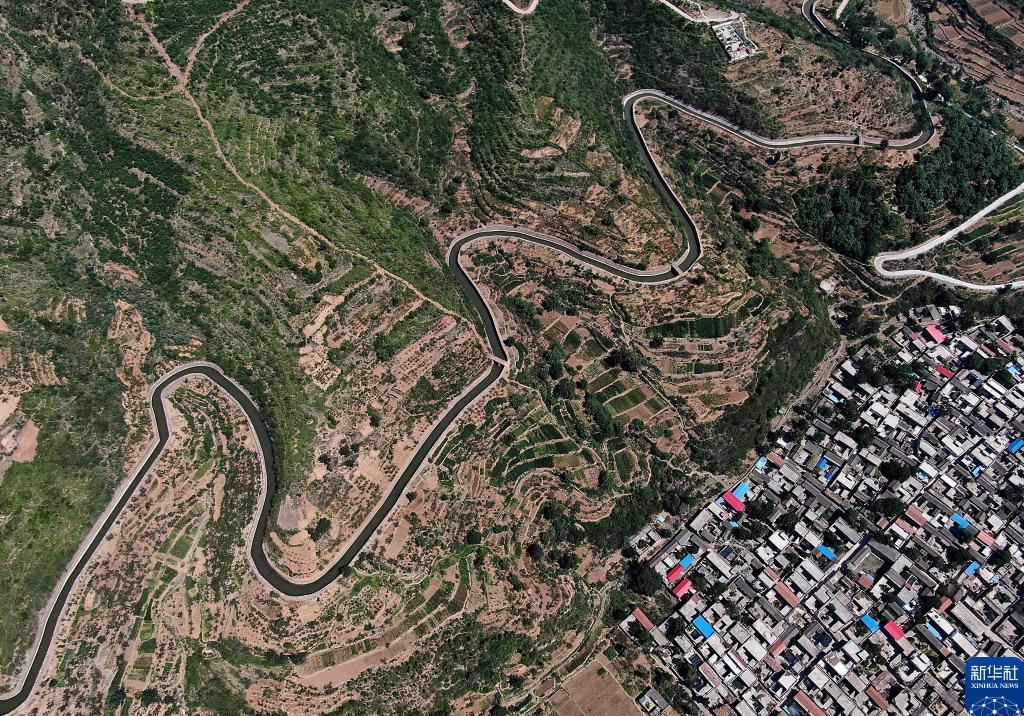 红旗渠总干渠从一座村庄旁绕过(2019年7月5日摄)。新华社记者 李安 摄