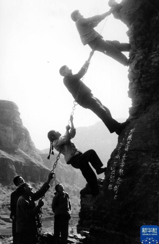 人们在红旗渠施工现场凌空除险(资料照片)。新华社发