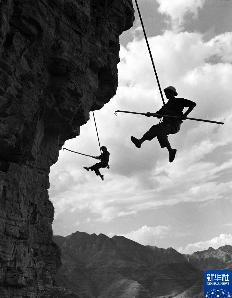 红旗渠建设过程中,人们腰系绳索、凌空作业(资料照片)。新华社发