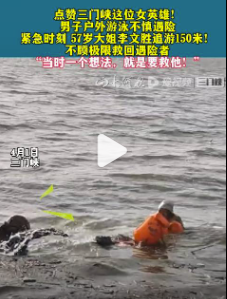 男子户外游泳不慎遇险 紧急时刻 57岁大姐李文胜追游150米!不顾极限救回遇险者
