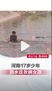 4月6日,河南新乡。2名女童在河边玩耍时不慎落水,邻村俩少年恰好路过,见此情景,17岁的闫帅莆来不及脱衣便纵身跳入河中。因为同伴胡肖珂不会游泳,就在岸边接应。闫帅莆事后回忆说:“当时啥也没想,就想着赶紧救人!”