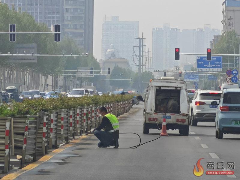 4月9日,环卫工人使用高压水枪对归德路机动车道内护栏进行冲洗,营造良好城市景观道路环境。记者 邢 栋 摄