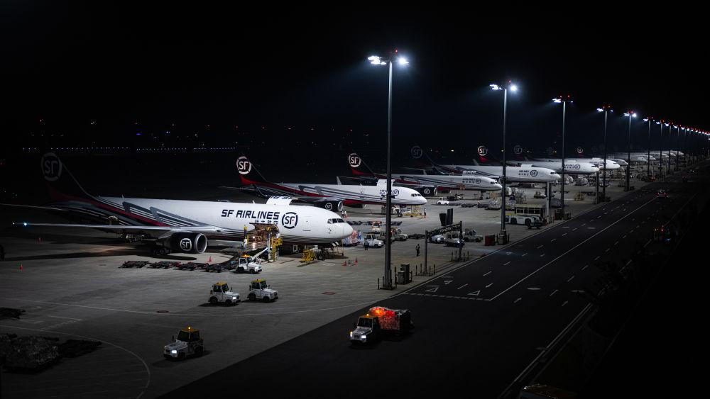 2024年5月25日凌晨,工人在湖北鄂州花湖国际机场停机坪装卸货物。鄂州花湖国际机场于2022年7月建成投运,是亚洲首个专业货运枢纽机场。截至2025年1月26日,鄂州花湖国际机场已开通37条国际货运航线和66条国内货运航线。路畅货通、互惠共富