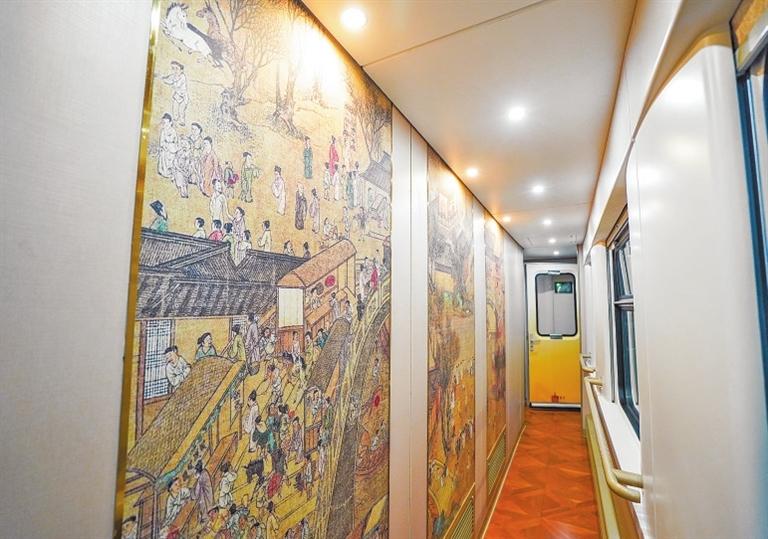 车厢内部设计以“行走的中原文化”为理念,凸显清明上河图之景等河南地域特色元素,打造移动文化展厅。崔轩豪 摄
