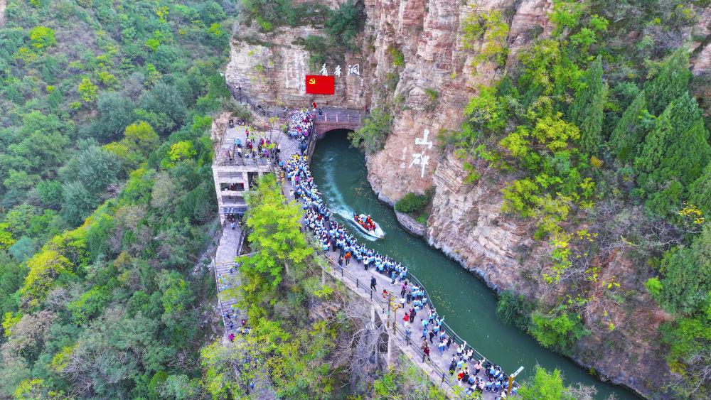 4月5日,学生在河南省林州市红旗渠青年洞开展研学活动(无人机照片)。新华社发(王梓骅摄)