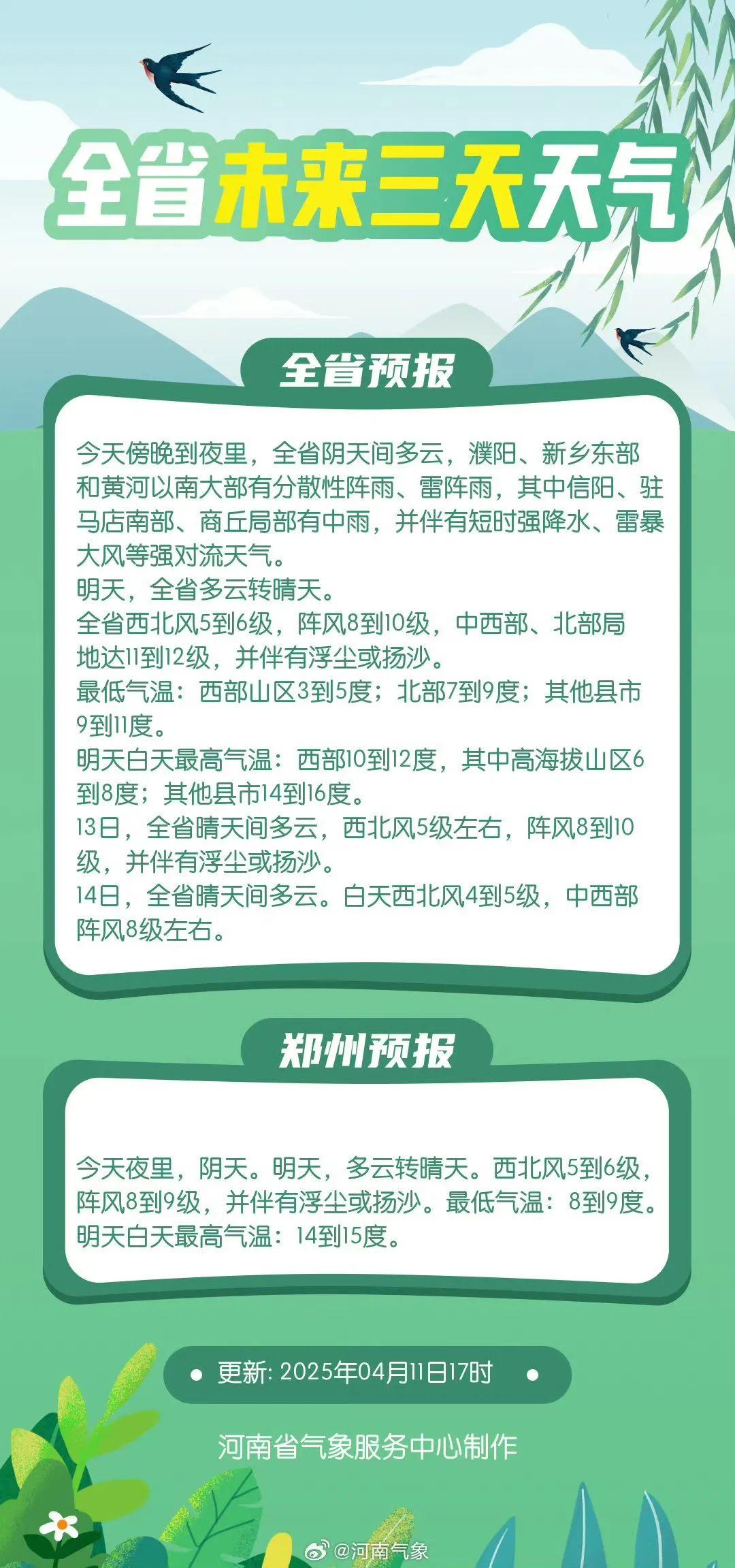 河南将迎大风、降雨天气!根据河南省气象台预报,今天夜里,黄河以南大部有分散性阵雨、雷阵雨,其中东部、南部局部有中雨,并伴有短时强降水、雷暴大风等强对流天气。同时这股冷空气制造大风的能力十分突出,今夜到明天,全省西北风5到6级,阵风8到10级,中西部、北部局地可达11到12级,并伴有浮尘或扬沙。
