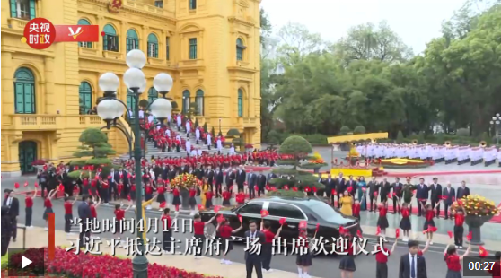 4月14日,中共中央总书记、国家主席习近平抵达河内对越南进行国事访问。当日下午,越共中央总书记苏林为习近平举行隆重欢迎仪式。