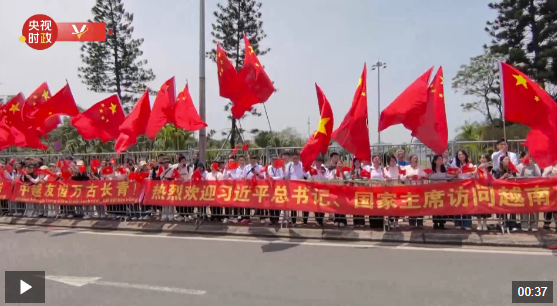 习近平乘车从机场赴下榻饭店途中,中越两党两国旗帜迎风飘扬,“中越友谊万古长青”、“山水相连,命运与共”、“中越情谊深,同志加兄弟”等红色横幅鲜艳夺目。当地民众和中资机构、留学生代表聚集在道路两旁,热烈欢迎习近平到访。
