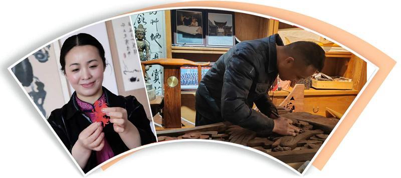 图①:省级非遗文化木兰剪纸传承人贾艳梅在讲解木兰剪纸的剪裁技巧。 图②:韩氏木刻制作现场。