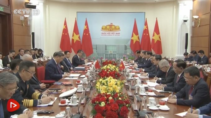 习近平指出,再次对越南进行国事访问,亲眼见证了越南革新事业取得的新成就,亲身感受到中越友好的深厚根基。当前,中国正在以中国式现代化全面推进强国建设、民族复兴伟业,越南即将开启民族发展新纪元,双方都处在各自发展振兴的关键时期。面对变乱交织的国际形势,中越两国要坚定道路自信和制度自信,加强团结协作,持续深化具有战略意义的中越命运共同体建设,携手迈向现代化,为世界注入更多稳定性和正能量。