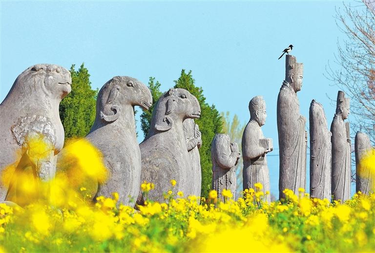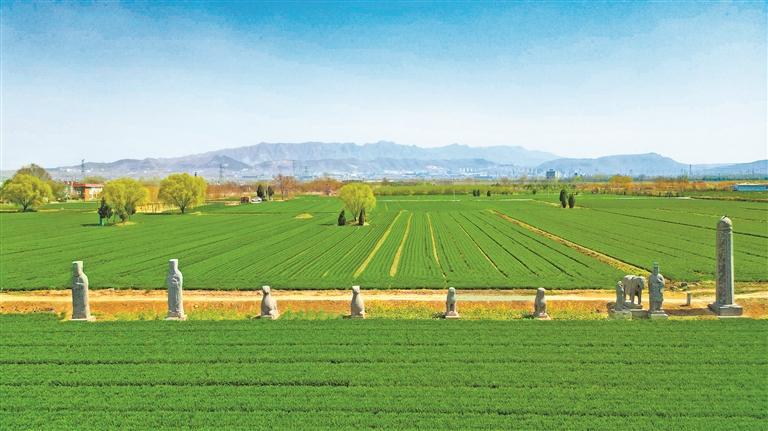 宋陵与麦田同框,石像生犹如“麦田的守望者”(3月25日摄)。