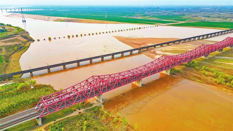 黄河奔流东去,高铁穿行于大河与麦田之上(3月30日摄)。