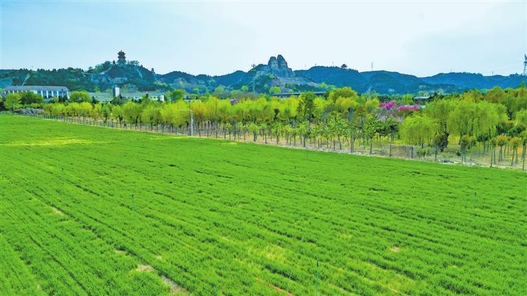 黄河文化公园里,炎黄二帝像凝视下的黄河岸边麦田(3月30日摄)。