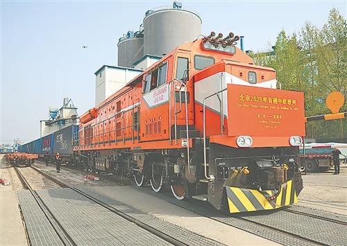 当日,一列满载空调、防水卷材、轮胎等货物的中欧班列从中国铁路北京局北京铁路物流中心琉璃河营业网点专用线缓缓驶出,驶向俄罗斯首都莫斯科,标志着今年首趟北京至莫斯科中欧班列顺利开行。据介绍,本次班列将从满洲里口岸出境,一路向西驶向莫斯科,全程约9000公里,预计运输时间16天。新华社记者 张晨霖 摄