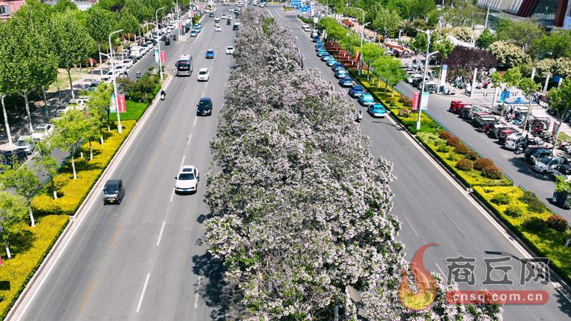 ◀4月15日,航拍归德南路道路中间绿化带内粉色的楸树花正热烈绽放,犹如一条粉色的飘带绵延向前,为都市增添了几分春意与生机。本报融媒体记者 邢 栋 摄