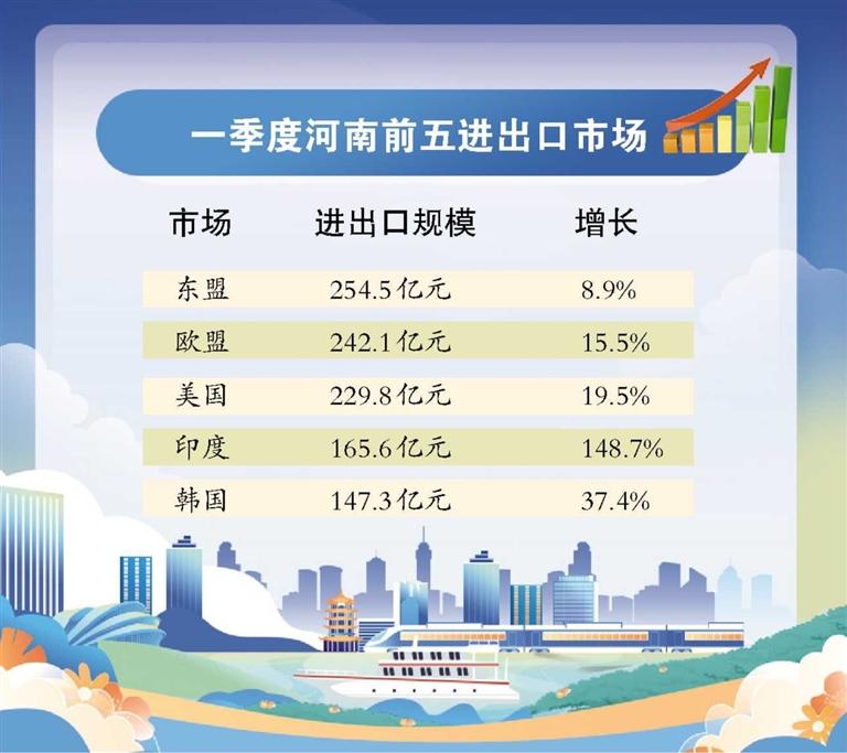 从进出口市场看,东盟、欧盟、美国、印度、韩国是河南前五大贸易伙伴。河南对共建“一带一路”国家和RCEP成员国进出口快速增长。