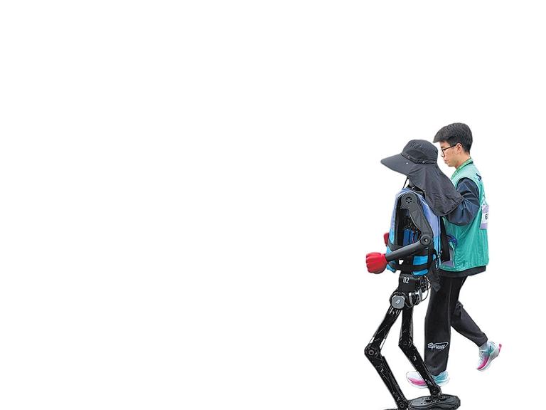 来自河南的EAI战队机器人卓益得X02在参加半程马拉松。 河南日报社全媒体记者 聂辉 摄