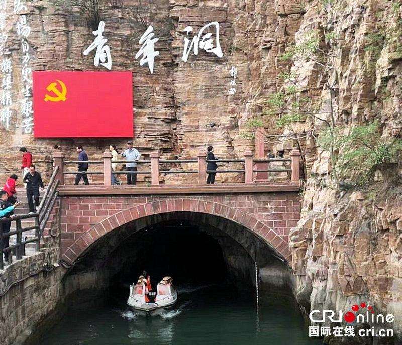 青年洞是红旗渠总干渠的咽喉工程之一,是红旗渠建设最艰巨的地段。沿着总干渠走向红旗渠青年洞,崖壁上“山碑“二字依然灼目。洞前那面红色的党旗,与渠水中的倒影叠合成跨越时空的对话,讲述着300青年突击队员艰苦奋斗的业绩。