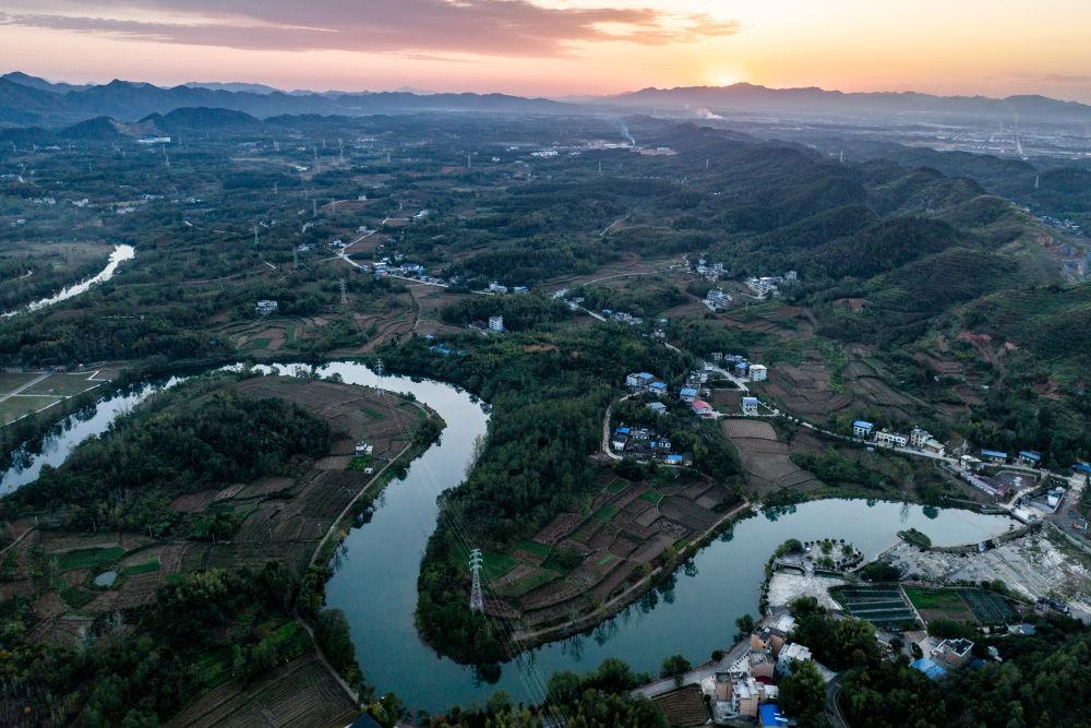 位于湖北崇阳县的白霓古堰(2023年11月6日摄,无人机照片)。