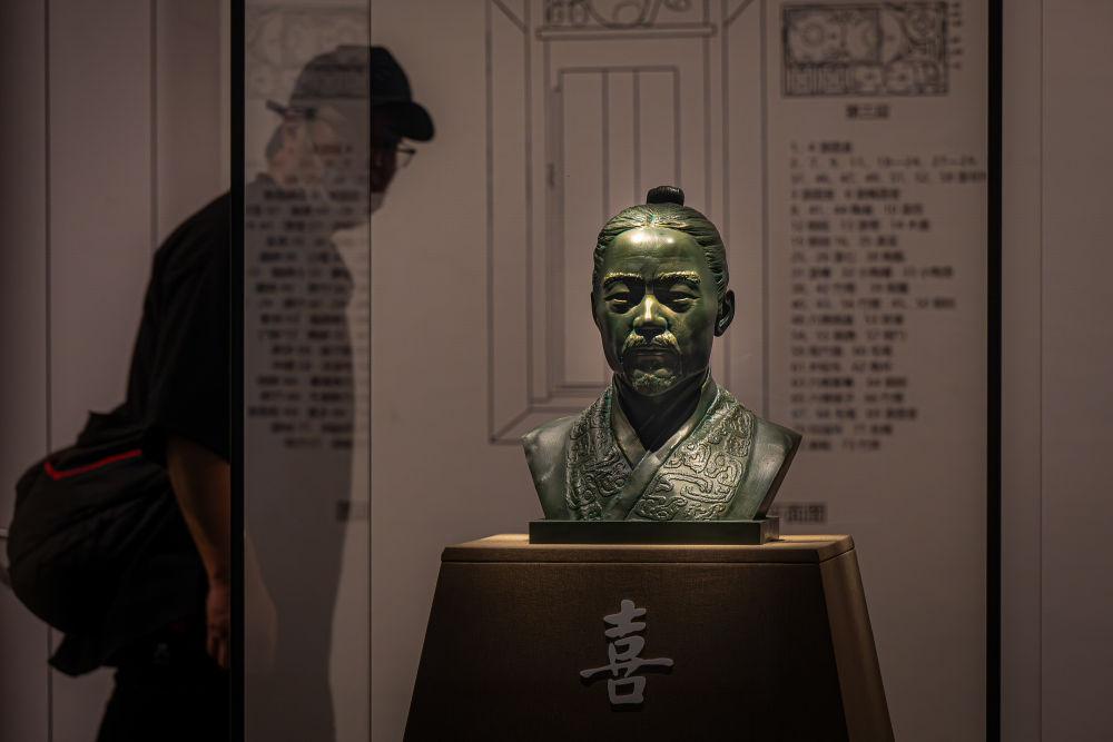 2024年4月30日,游客在湖北省博物馆观看云梦睡虎地秦简主人“喜”的3D复原头像。 当日,湖北省博物馆策划的专题展览“惠此简书——睡虎地秦墓出土简牍”开幕,首次展出科技考古研究成果——“喜”的3D复原头像。