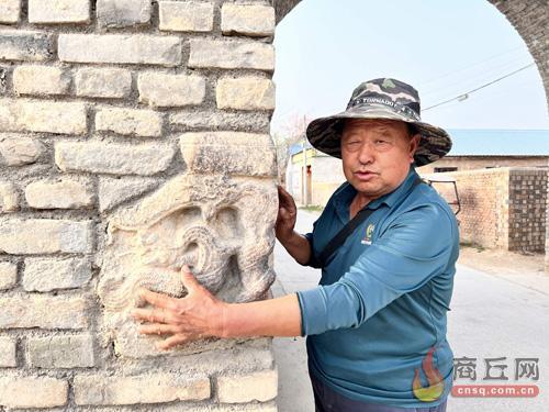 郝正旺老人抚摸着南寨门上的石雕讲述着老谢集村的故事。