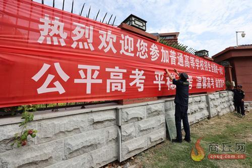 6月5日上午,在商丘市第一高级中学校门外,工作人员正在悬挂横幅、摆放“禁鸣”提示牌、调试安检设备。2025年高考将于6月7日至9日举行,商丘众多学子将奔赴考场,为梦想全力以赴。今年商丘市共设9个高考考点,分别为:商丘市第一高级中学、昌华高级中学、商丘市实验中学(高中部)、商丘市回民中学、商丘市第三高级中学、商丘市第二高级中学、商丘市应天高级中学、商丘市第四高级中学、商丘商贸学校。本报提醒广大考生和家长,一定要提前规划好路线和出行方式,预留充足的时间,以防因交通拥堵耽误考试。
