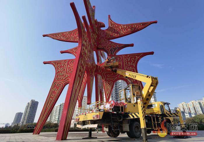 11月14日中午,市政工程管理处的工作人员正在养护维修我市标志性雕塑“商”字。此次养护维修主要是针对雕塑红色漆面风化、脱落部分进行清理,重新粘贴反光膜。养护维修预计11月21日前后完成。“商”字是商丘市的城市地标,坐落在神火大道与南京路交会处的环岛内,雕塑高21米、横向跨度22米,建成于1997年6月29日。