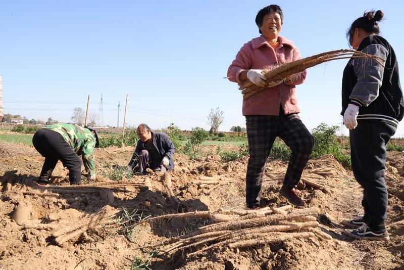 11月6日,立冬将至,虞城县店集乡河东张庄种植的山药喜获丰收,进入收获期。近年来,该县将传统农业与现代农业种植相结合,加快发展扶持龙头品牌产业,形成“一村一品”基地+合作社+公司+农户发展模式,带动辐射“一乡多业”产业链发展,促进农民增收 。 本报融媒体记者 邢 栋 摄