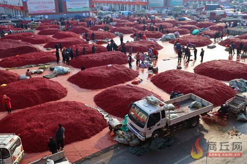 11月27日,柘城县辣椒大市场正在进行干椒交易。近年来,柘城县坚持“规模化种植、链条化发展、标准化生产、国际化营销”的发展思路,形成了集新品种研发、规模种植、精深加工、仓储贸易、会展经济为一体的辣椒全链条产业格局。目前,柘城全县有20万人聚集在辣椒产业链上,辣椒种植面积常年稳定在40万亩,年产干椒12万吨。 张超 摄
