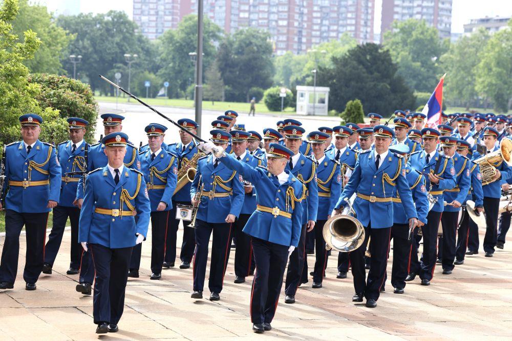 当地时间5月8日,国家主席习近平在贝尔格莱德出席塞尔维亚总统武契奇举行的隆重盛大欢迎仪式。欢迎仪式在塞尔维亚大厦南广场举行。两国元首共同登上检阅台,军乐团奏响中塞两国国歌,鸣10响礼炮。习近平在武契奇陪同下检阅仪仗队。