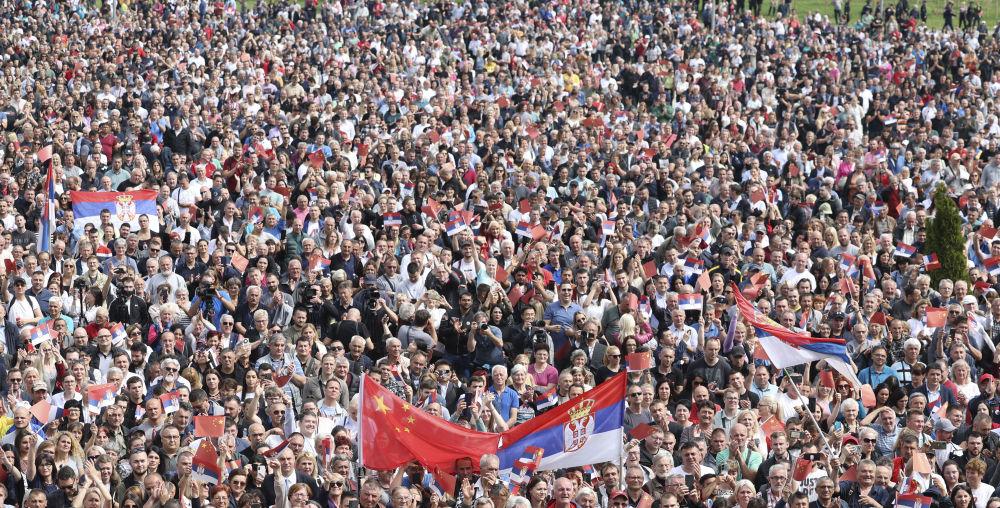 大厦广场上,一万五千名塞尔维亚民众挥舞中塞两国国旗,对习近平表示最热烈的欢迎。
