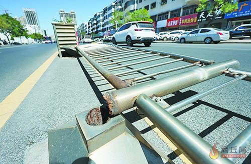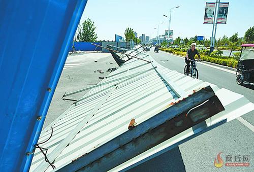 5月15日上午,记者在商丘高铁站广场对面看到,受前日夜里大风影响,个别路段施工围挡损坏;民主路与归德路交叉口东侧一段交通护栏也被大风吹倒,希望有关部门尽快维修。