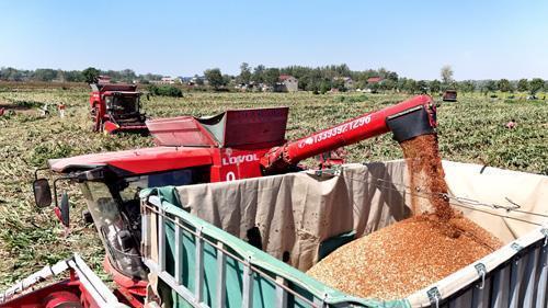 10月7日,收割机在柘城县安平镇红高粱地收获成熟的红高粱。该镇种植2万亩“红缨子”高粱,并与贵州酿酒企业签订了种植合同,每亩高粱收益1000多元,拓宽了群众增收路。 张超 摄
