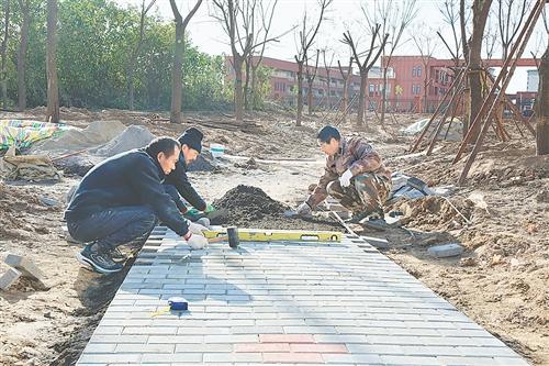 11月26日,睢阳区九州路与明伦路交叉口西南角,正在建设的“口袋公园”里,新栽的近百棵绿化树木迎风挺立,施工人员正在铺设公园步道,现场一派忙碌的景象。