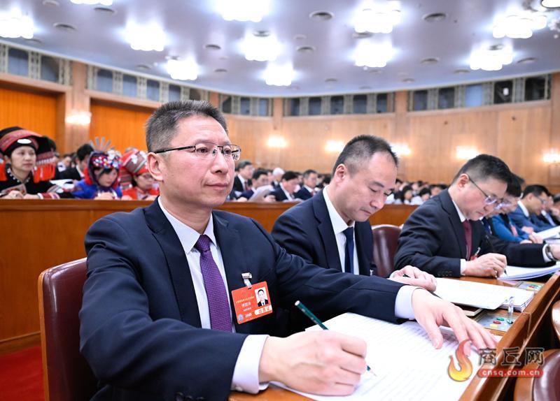 3月5日,全国人大代表、贵州省安顺市镇宁布依族苗族自治县六马镇致富村党支部书记、村委会主任卢丹(中)在北京出席十四届全国人大三次会议贵州代表团全体会议。 春来千景盛,岁启万象新。三月的北京人民大会堂迎来举世瞩目的盛会。近3000名全国人大代表和2100多名全国政协委员,齐聚首都,共商国是。新华社记者 翟健岚 摄