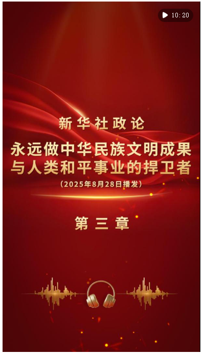 新华社8月28日播发《新华社政论|永远做中华民族文明成果与人类和平事业的捍卫者——写在中国人民抗日战争暨世界反法西斯战争胜利80周年之际》。我们邀请诵读嘉宾吴樾演播“第三章”。