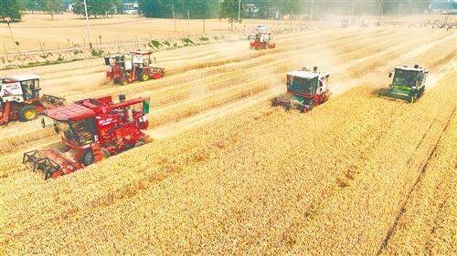 梁园区水池铺镇高标准农田里,收割机穿梭在麦田里收割小麦。