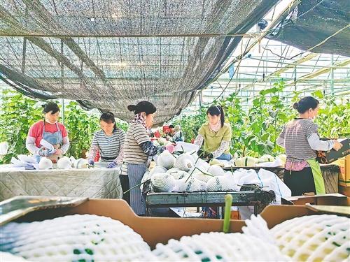 睢县尚屯镇回示村云瓜园里,村民们正在分拣、包装蜜瓜。 苗 鑫 摄