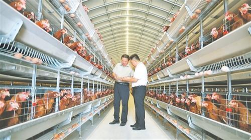 柘城县张桥镇张六口村的养鸡场内,工作人员在查看蛋鸡产蛋情况。张 超 摄