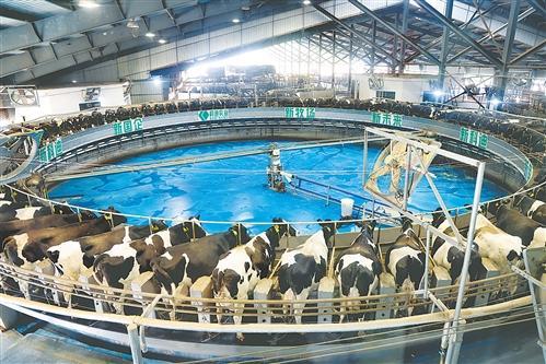 虞城县田庙镇科迪集团万头生态智慧牧场内自动化挤奶设备。