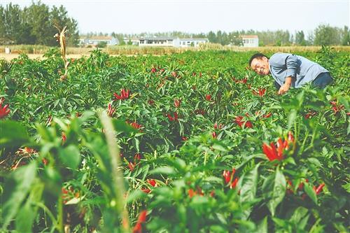睢阳区坞墙镇大孙庄辣椒种植户正在查看辣椒成熟度。